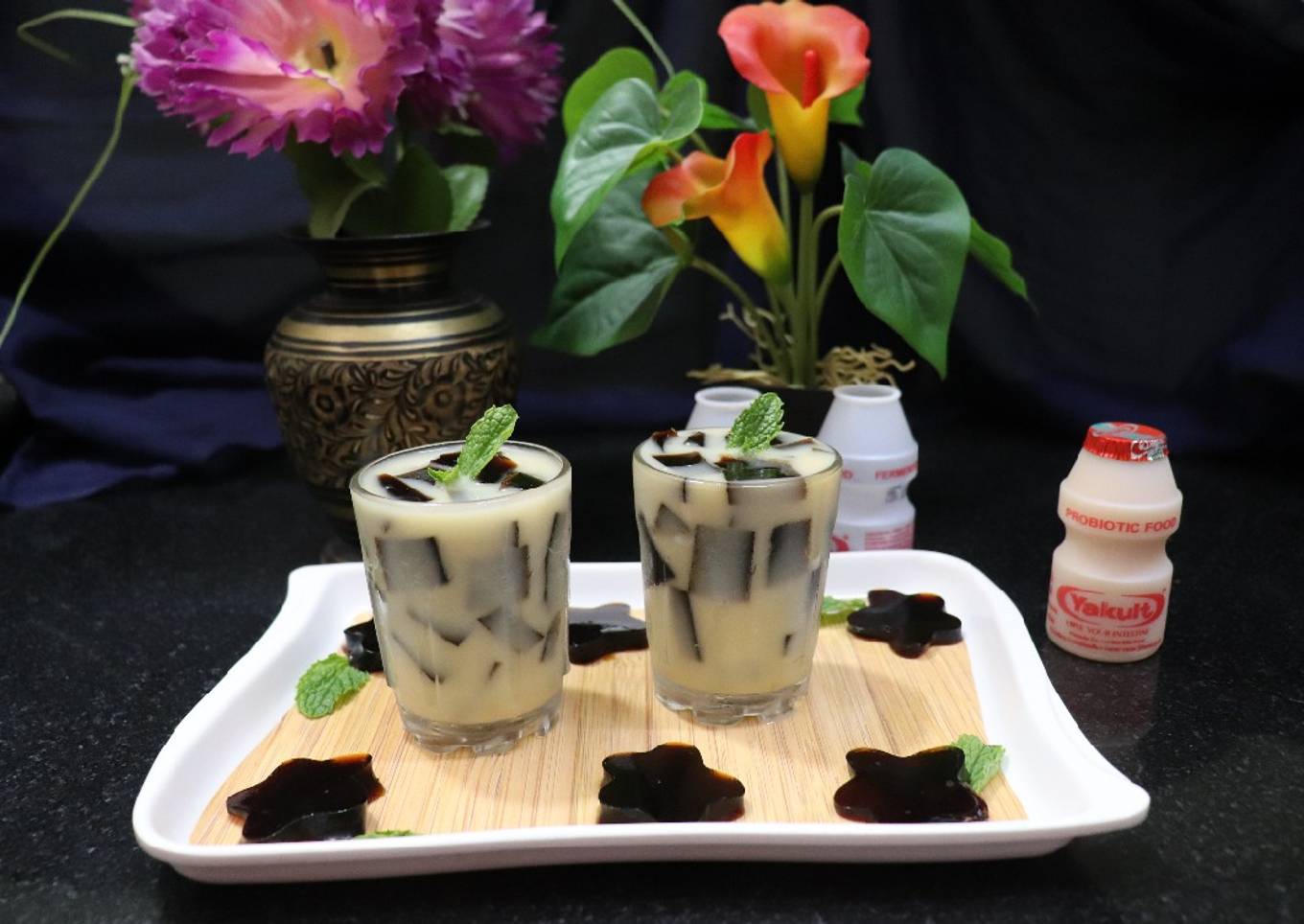 - Now take a cup, add the coffee jellies. Just when you feel like consuming, open a bottle of Yakult, pour it and serve immediately.