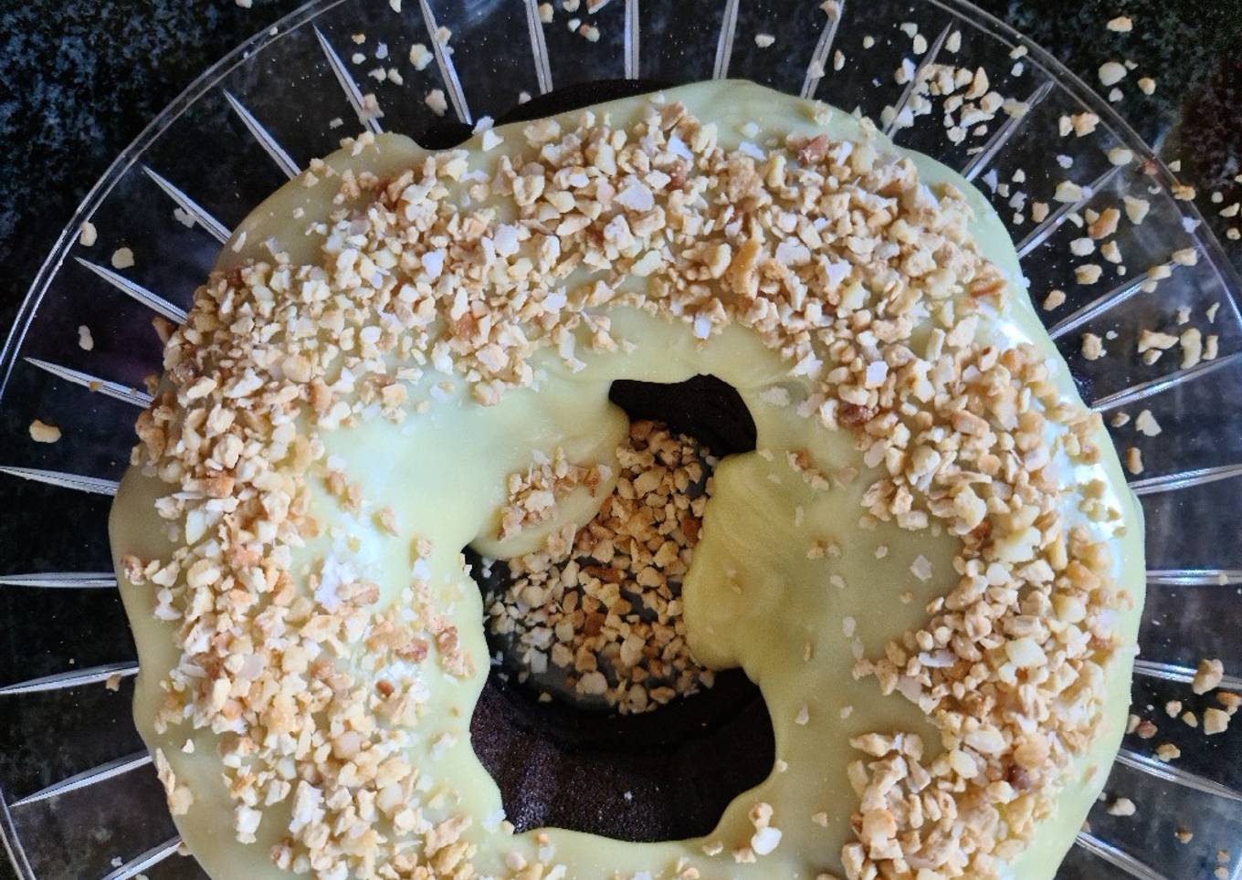 - Pour the ganache over the cooled cake. Decorate with crushed nuts.