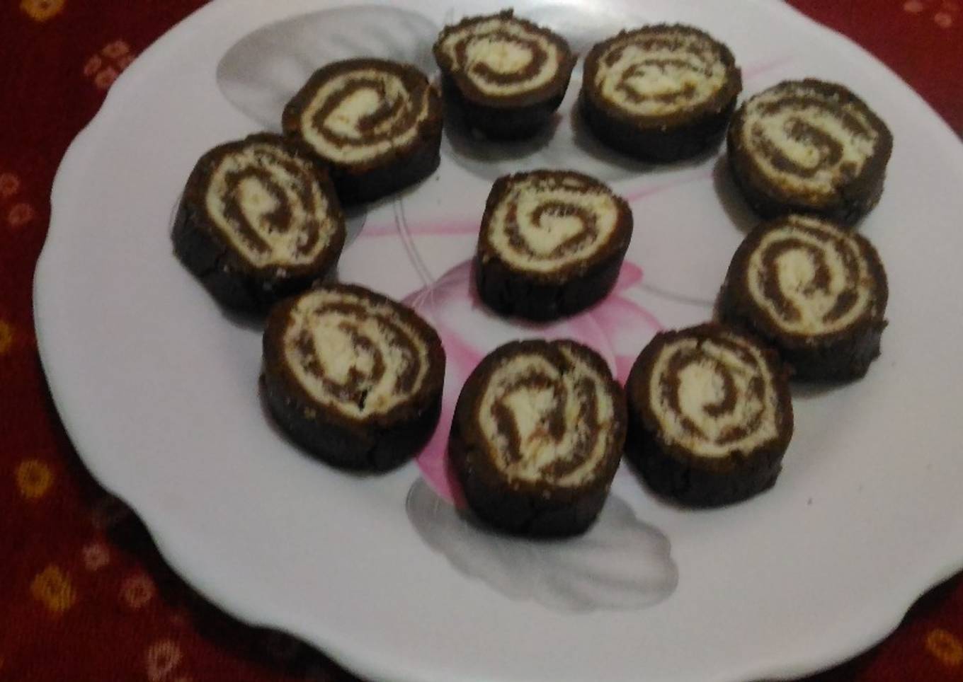 - Grease the plastic sheet and roll the biscuit dough and on the top spread the paneer mixture and roll it tightly