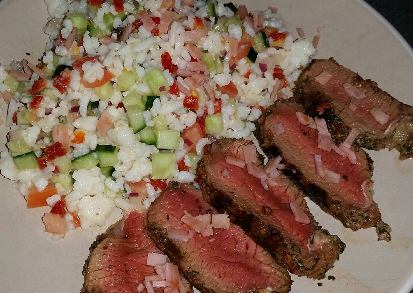 Many things affect the quality of taste from Grilled greek beef w' cold rice salad & bacon crumble, starting from the type of ingredients, then the selection of fresh ingredients, the ability to cut dishes to how to make and serve them. Don't worry if you want to prepare Grilled greek beef w' cold rice salad & bacon crumble delicious at home, because if you already know the trick then this dish can be used as an extraordinary special treat.