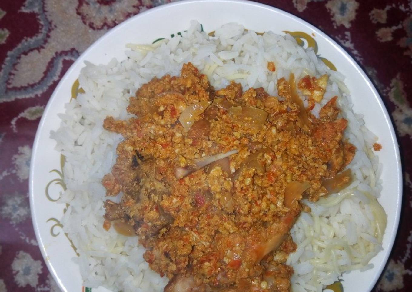 - Sauté some onions in oil. Add in the blended mixture. Allow to fry until the liquid in is almost dried. Add in the grilled chicken, 2 tbsp of water, seasoning and spices. Turn the flame to very low.