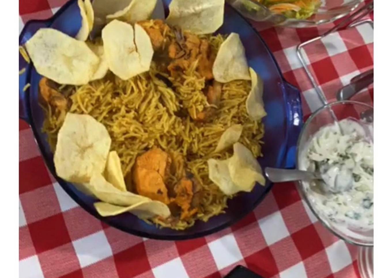 - Jab rice pak jaye dum pe rakhne se pehle upper grill chicken rakh dein thora sa biryani essence serve with French fries raita salad