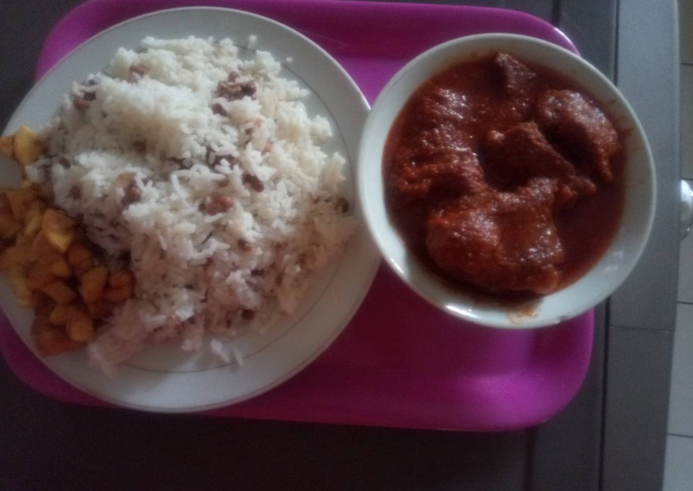 White Rice mixed with Beans and diced plantain with stew